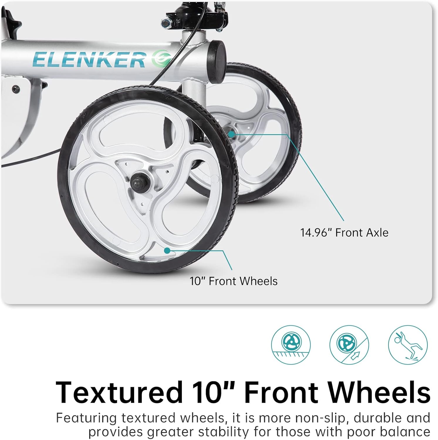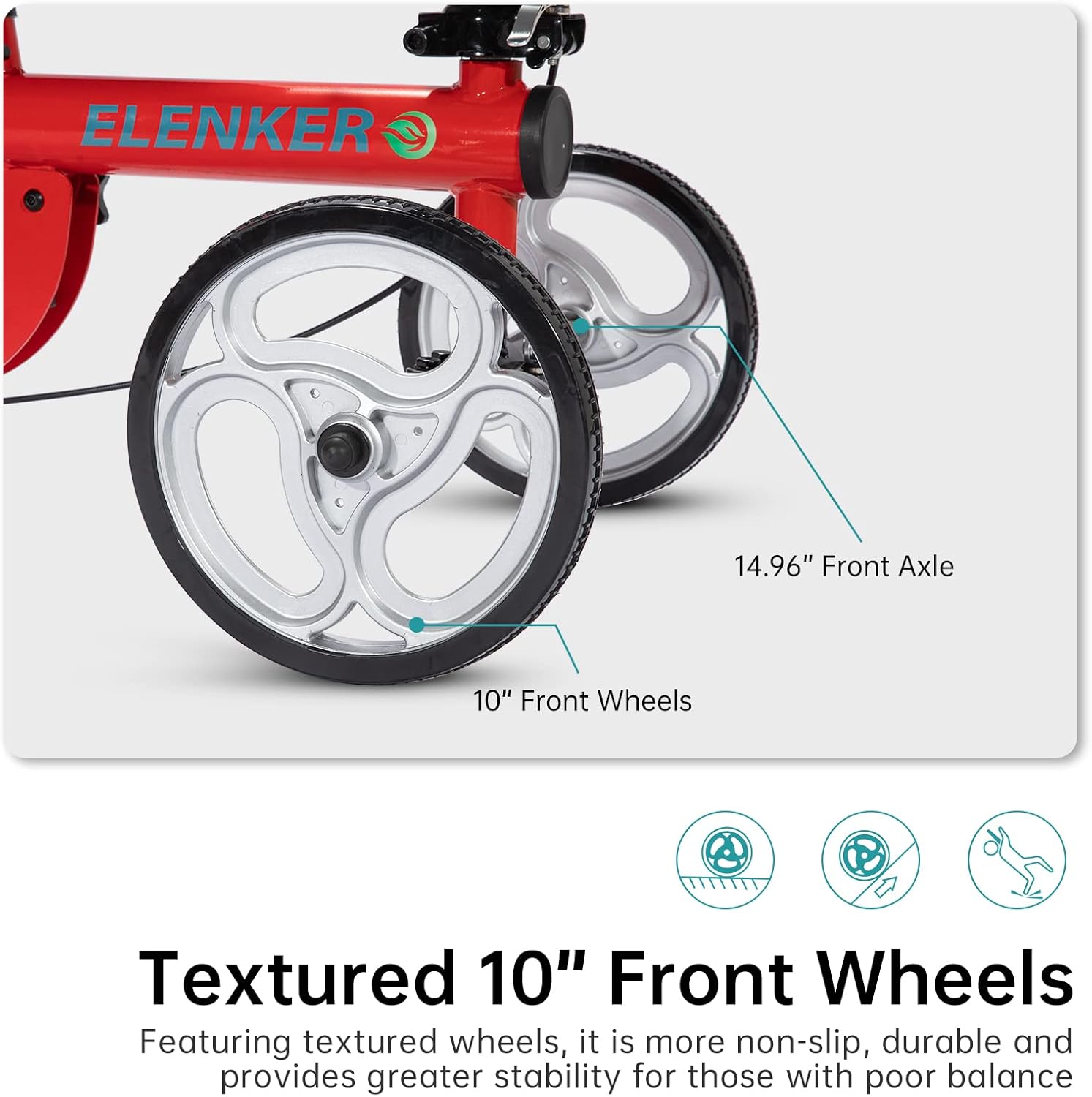 - Stable Wheels: 10" front wheels and 8" rear wheels provide an exceptionally stable base and are easy to maneuver, with a braking system for quick stopping