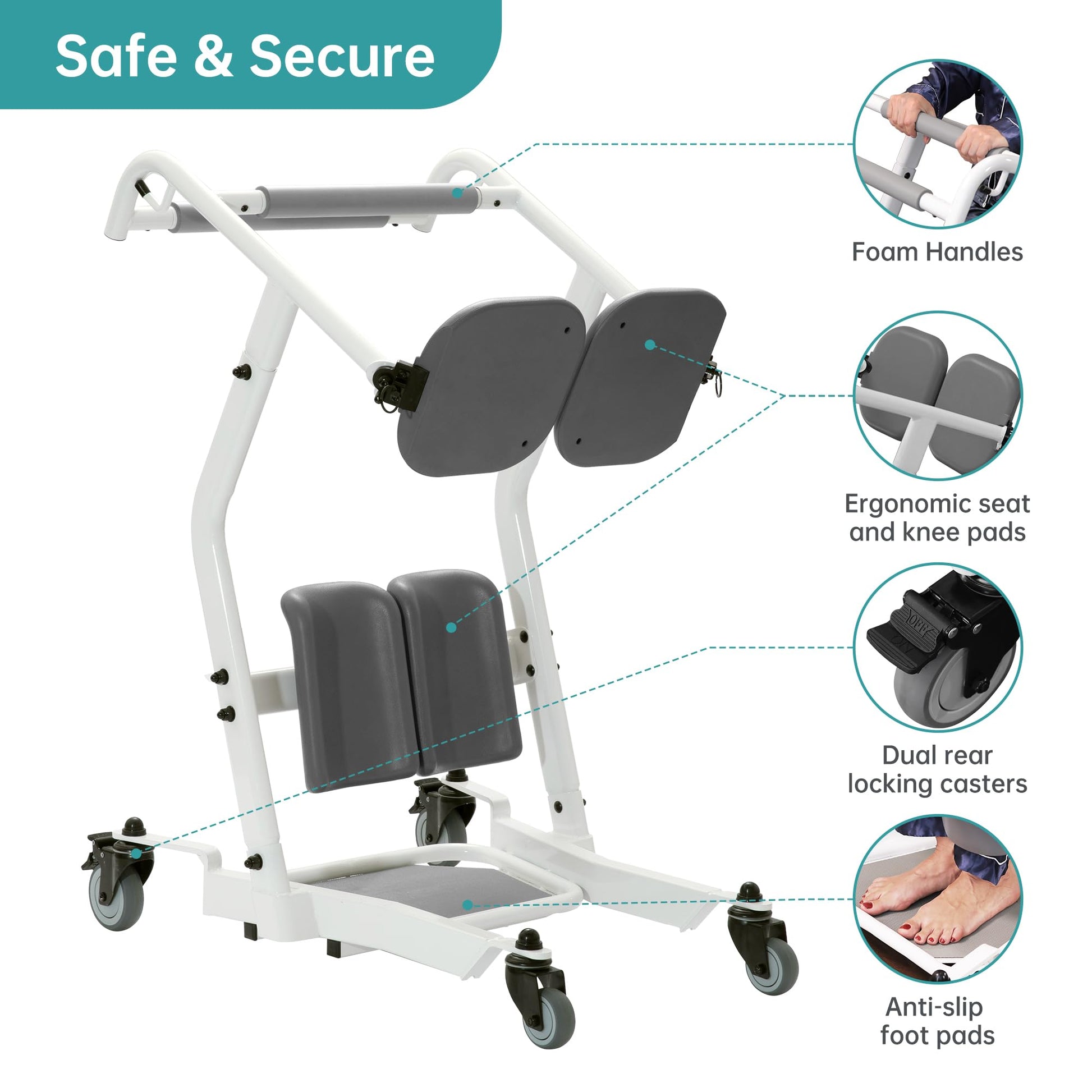 - Stand Assist: The full body design and a low center of gravity enhance patient stability,preventing falls and minimizing the risk of injury during transfers, and providing peace of mind for both patients and caregivers.