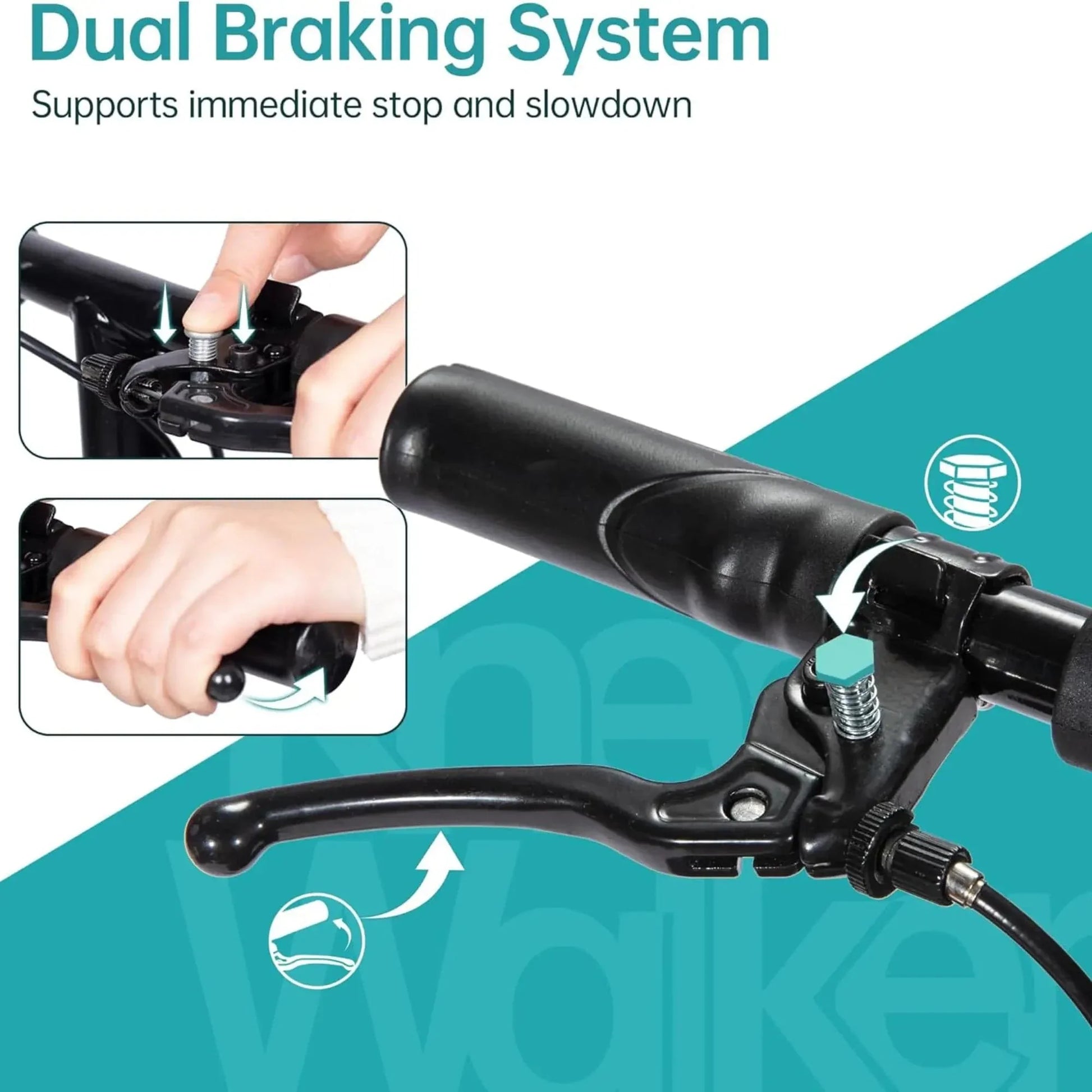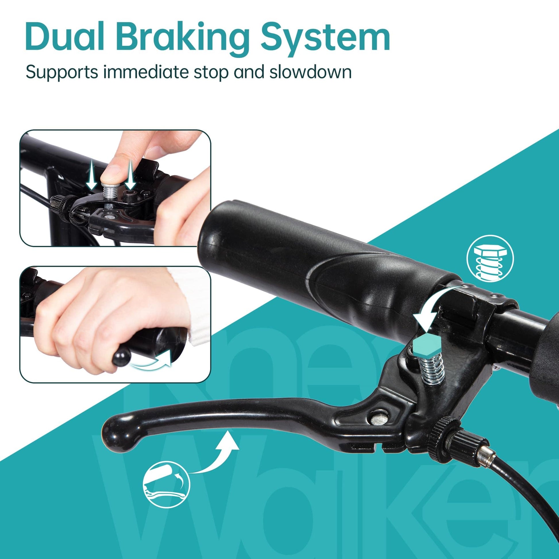 - Aneuver steerable knee scooter walkers feature 10" front wheels and 8" rear wheels, adjustable locking handbrakes and rear on-wheel brakes.