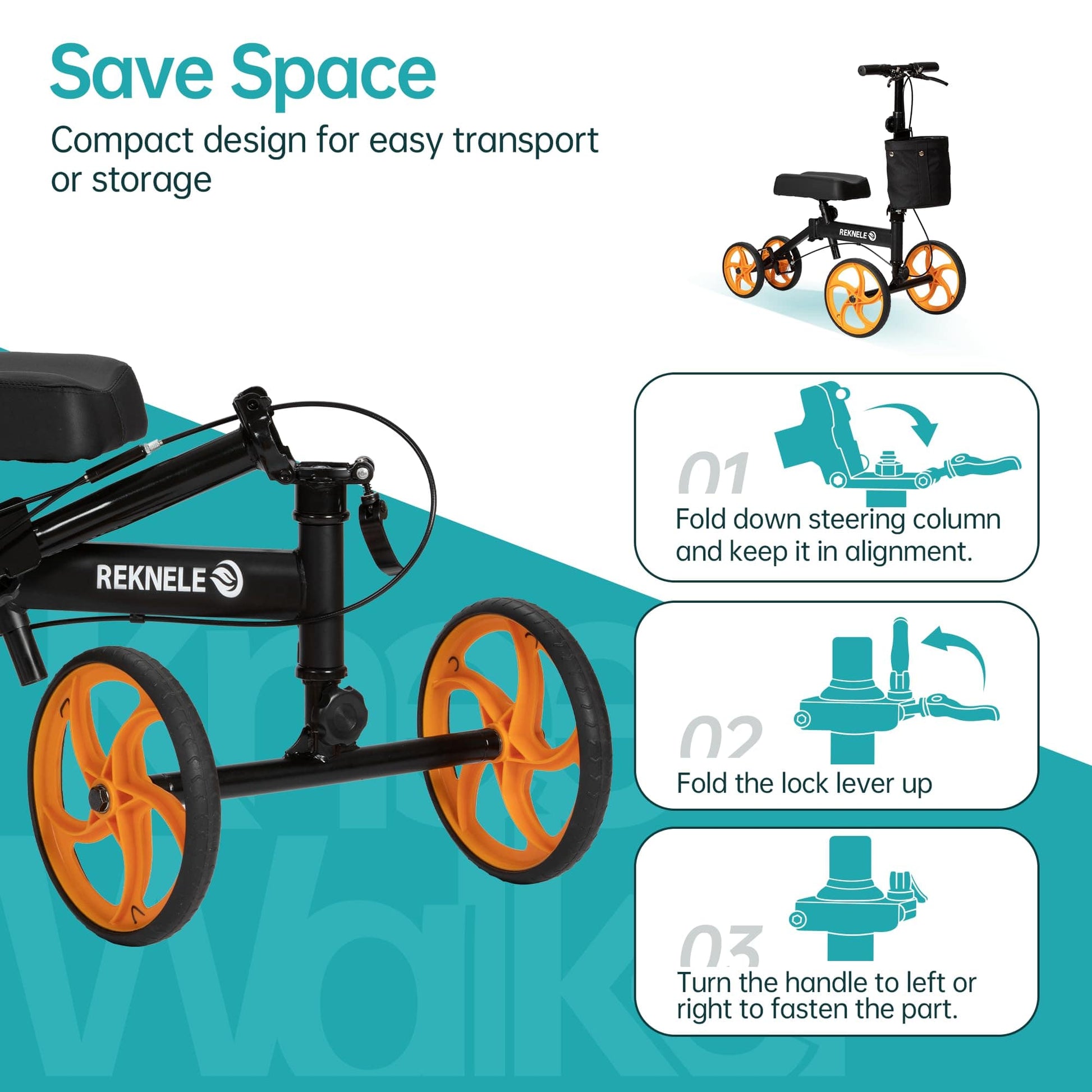 - Steering column can be easily folded for transport and storage; The knee pad and Handles can be adjusted to fit your height.