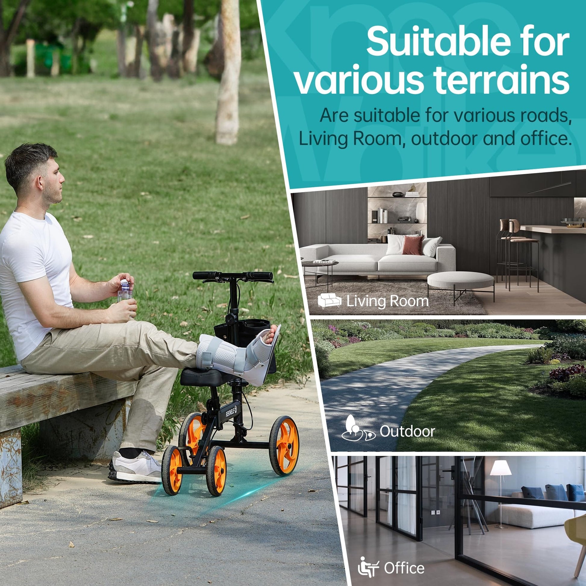 - Use our knee walker, your recovery won't slow you down or stop you from enjoying your day. You don't have to worry about not being able to get around, perfect for navigating your home, work, supermarket, park. Please note: don't slide at high speed for your safety. Recommended speed: 1m/s.