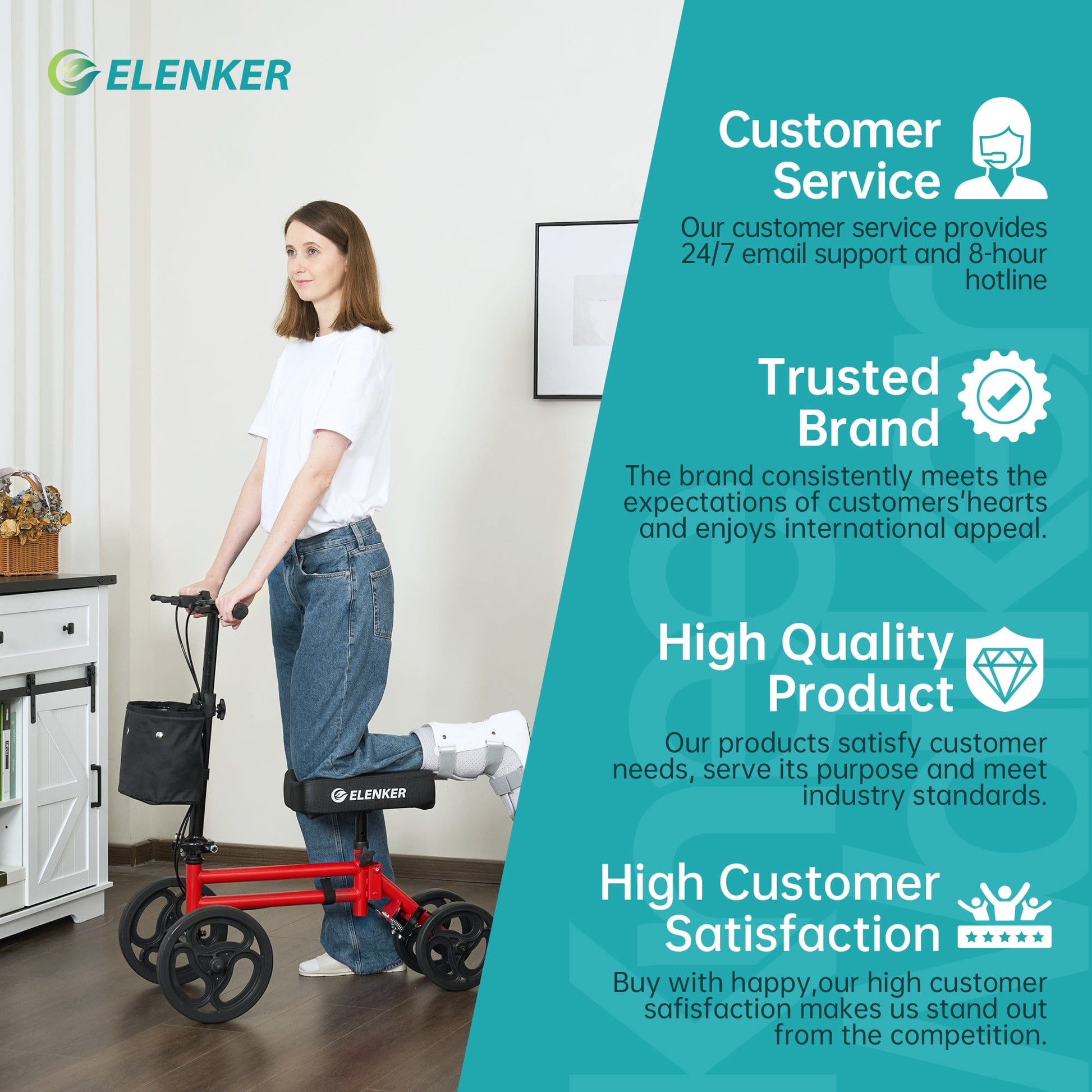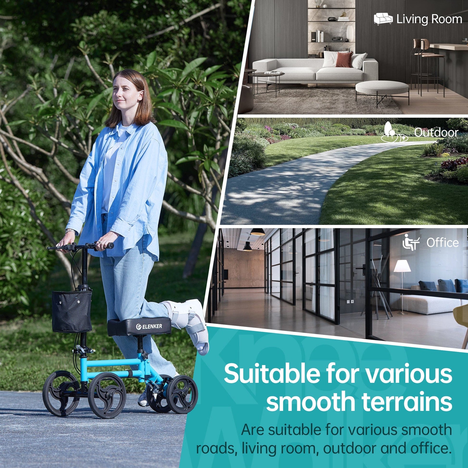 - Safety and Stability - This ELENKER knee scooter includes efficient dual braking system to help safely slow down or stop, Four 8-inch PVC wheels suitable for indoor and outdoor smooth ground.
